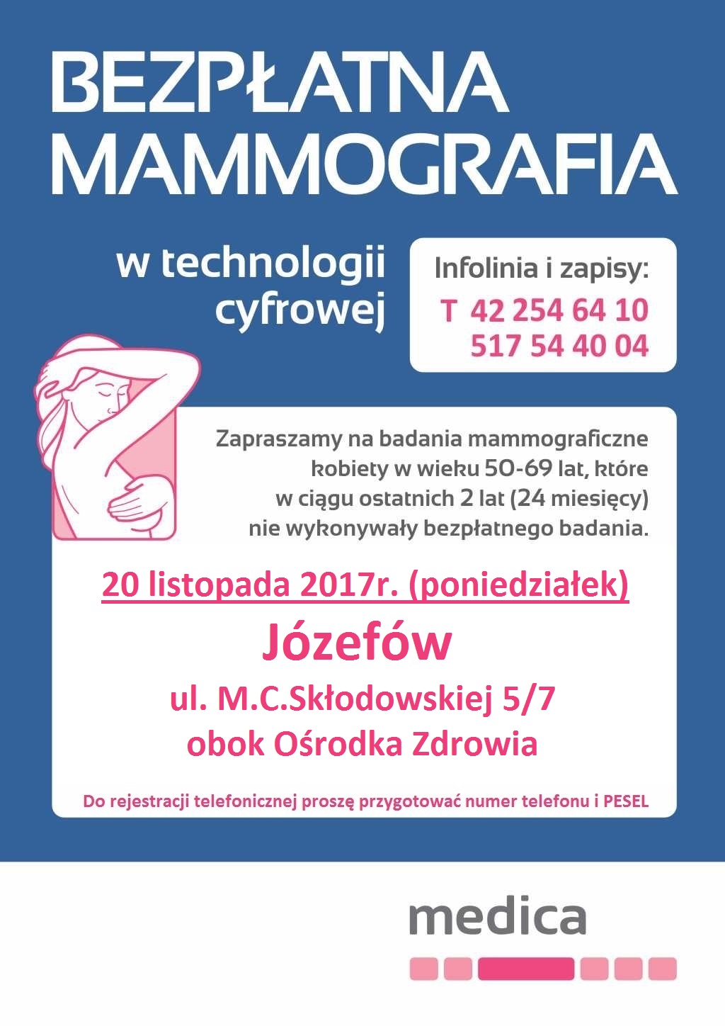 20 LISTOPADA 2017 r. bezpłatne badania mammograficzne finansowane przez Narodowy Fundusz Zdrowia
