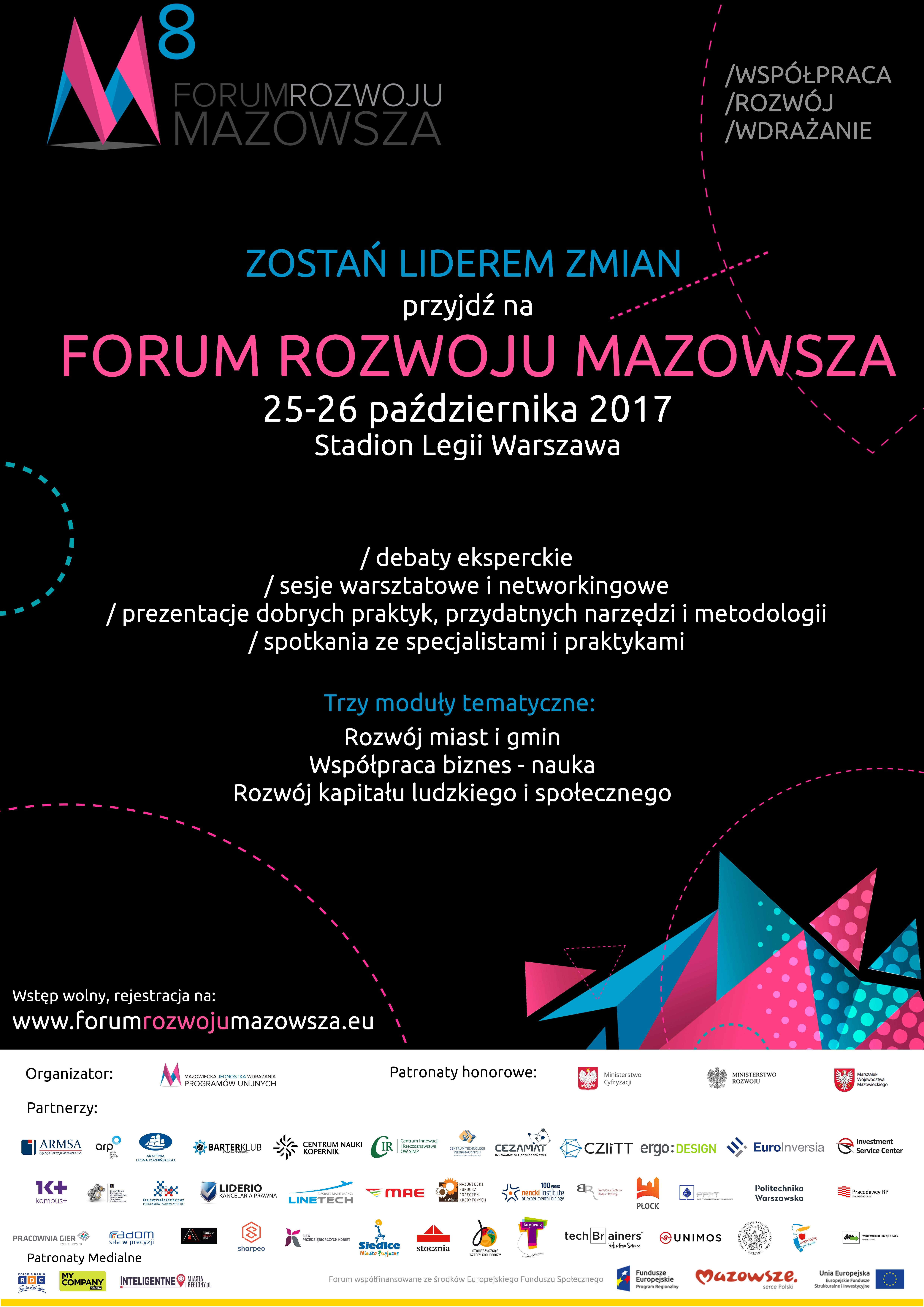 Podczas 8. Forum Rozwoju Mazowsza będzie można przekonać się jak pozyskać i prawidłowo rozliczyć unijne dofinansowanie, w jakich branżach warto rozwijać swoje przedsiębiorstwa i jak zwiększać atrakcyjność i dostępność usług dla mieszkańców. Organizatorem spotkania jest Mazowiecka Jednostka Wdrażania Programów Unijnych. Wydarzenie odbywa się pod honorowym patronatem Marszałka Województwa Mazowieckiego, Ministerstwa Rozwoju i Ministerstwa Cyfryzacji.