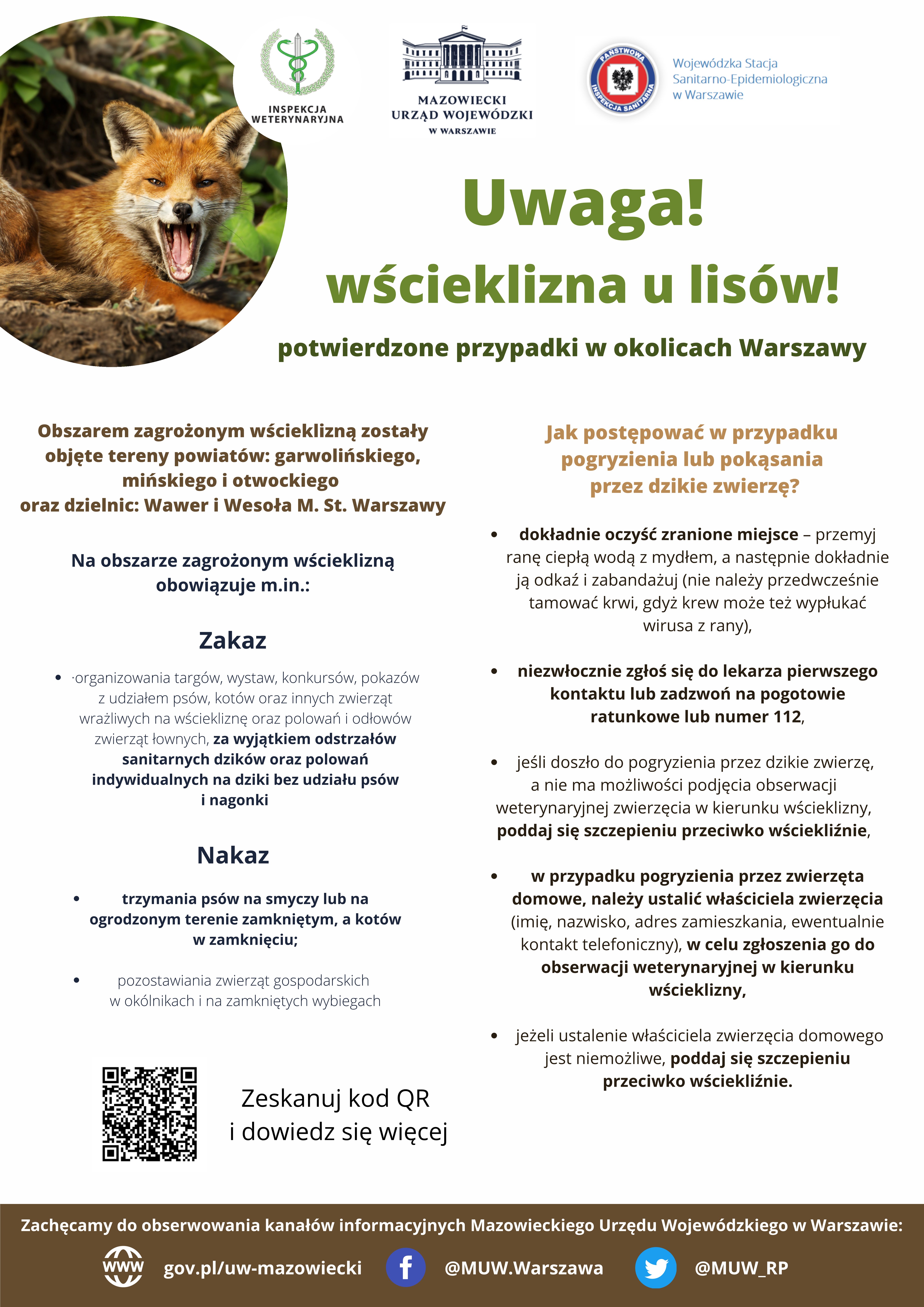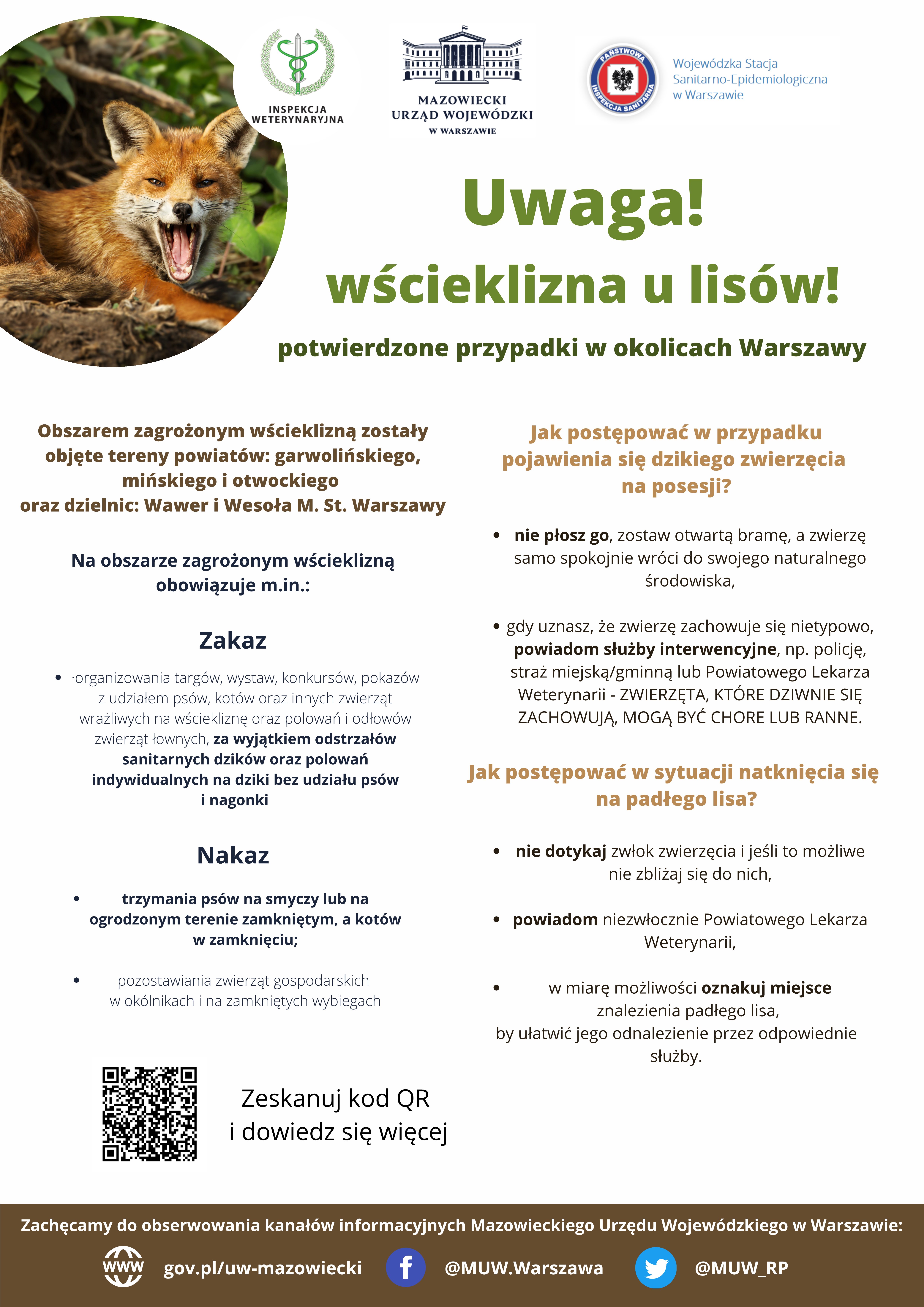 Na terenie Mazowsza pojawia się coraz więcej przypadków wścieklizny u lisów. Przypominam, że to bardzo groźna i prawie zawsze śmiertelna choroba. Dlatego apeluję o szczególną ostrożność, unikanie kontaktu z dzikimi zwierzętami oraz o przestrzeganie zakazów i nakazów obowiązujących na terenach zagrożonych wścieklizną. Proszę również pamiętać o bezpieczeństwie naszych zwierząt; szczepienie psów jest obowiązkowe, ale zaleca się szczepić również koty - powiedział Wojewoda Mazowiecki.