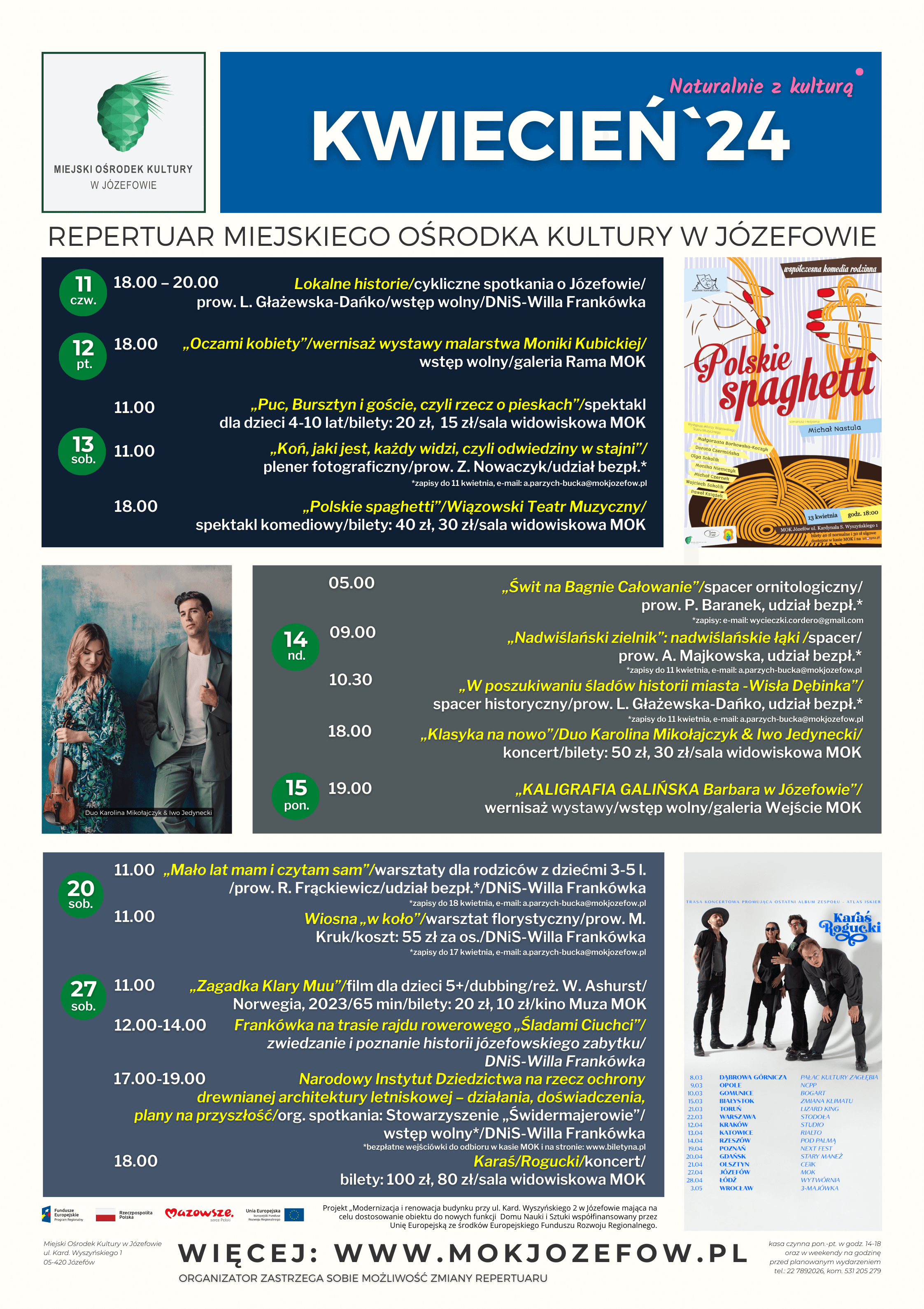 W józefowskim ośrodku kultury jak zwykle ciekawie: wernisaże, koncerty, spektakle i - co wiosną szczególnie przyjemne - spacery. Poznajcie kwietniowe propozycje MOK.