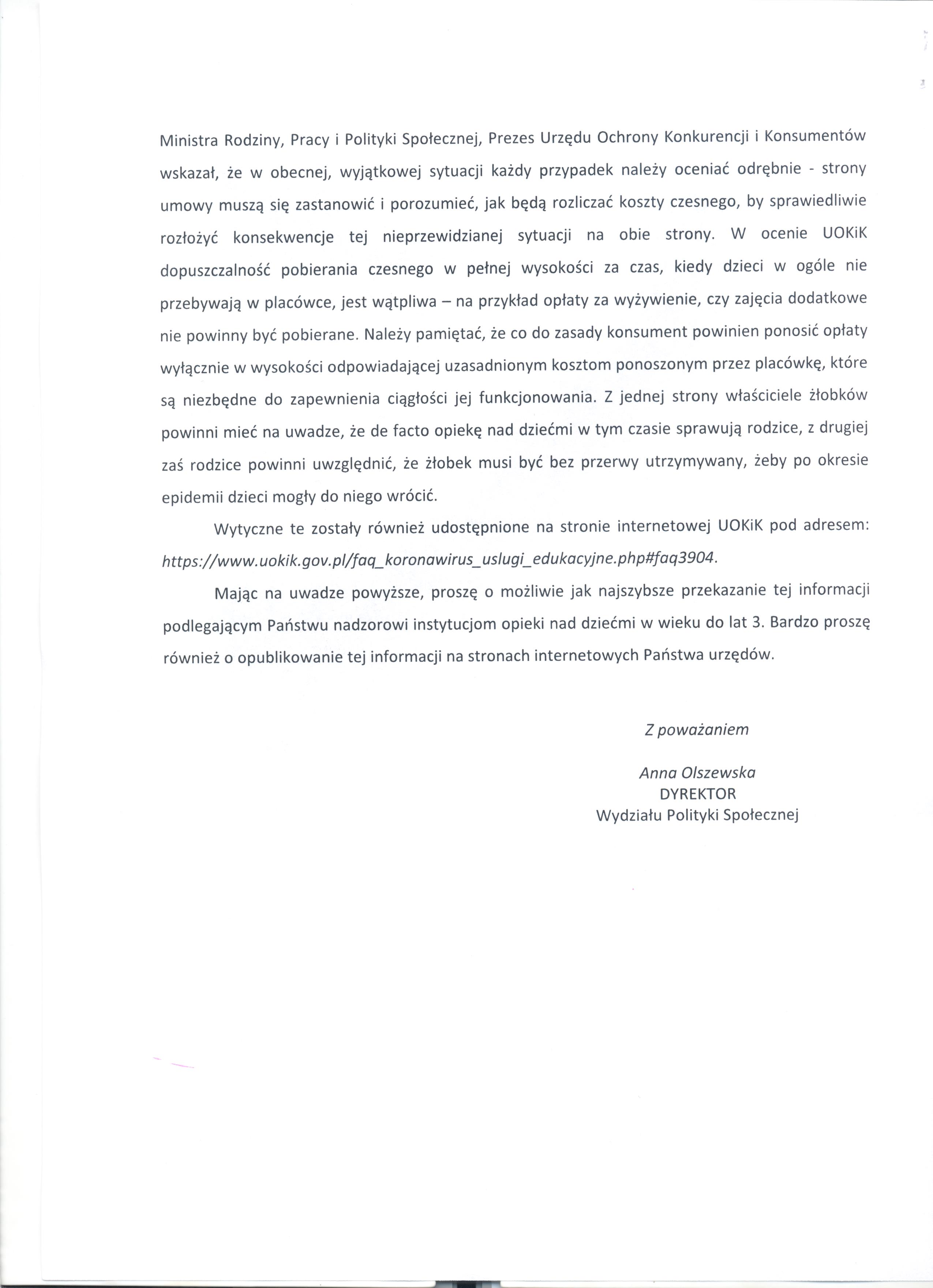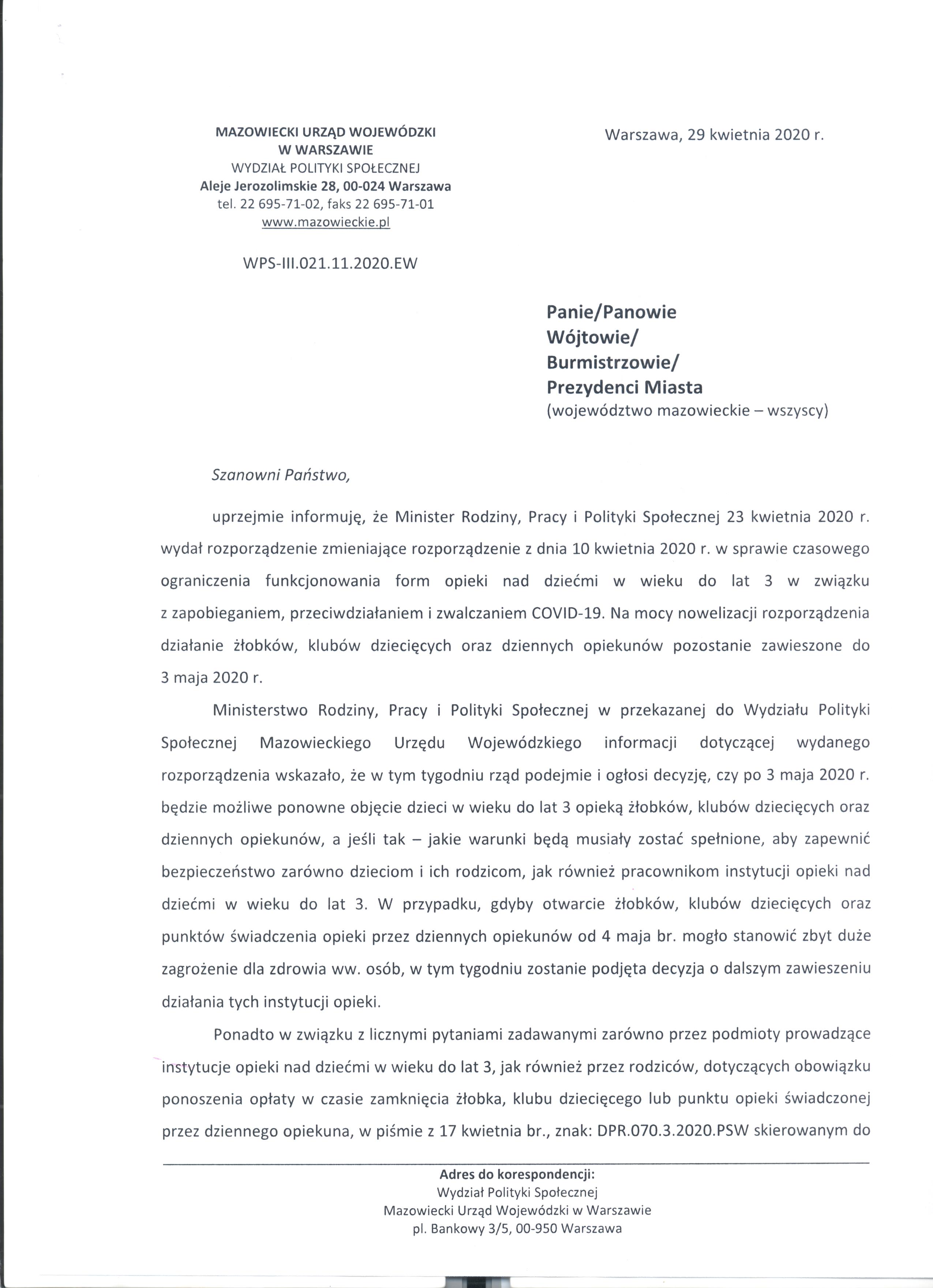 Pismo Mazowieckiego Urzędu Wojewódzkiego w sprawie przewidywanego uruchomienia żłobków oraz płatności czesnego za okres ich zamknięcia.