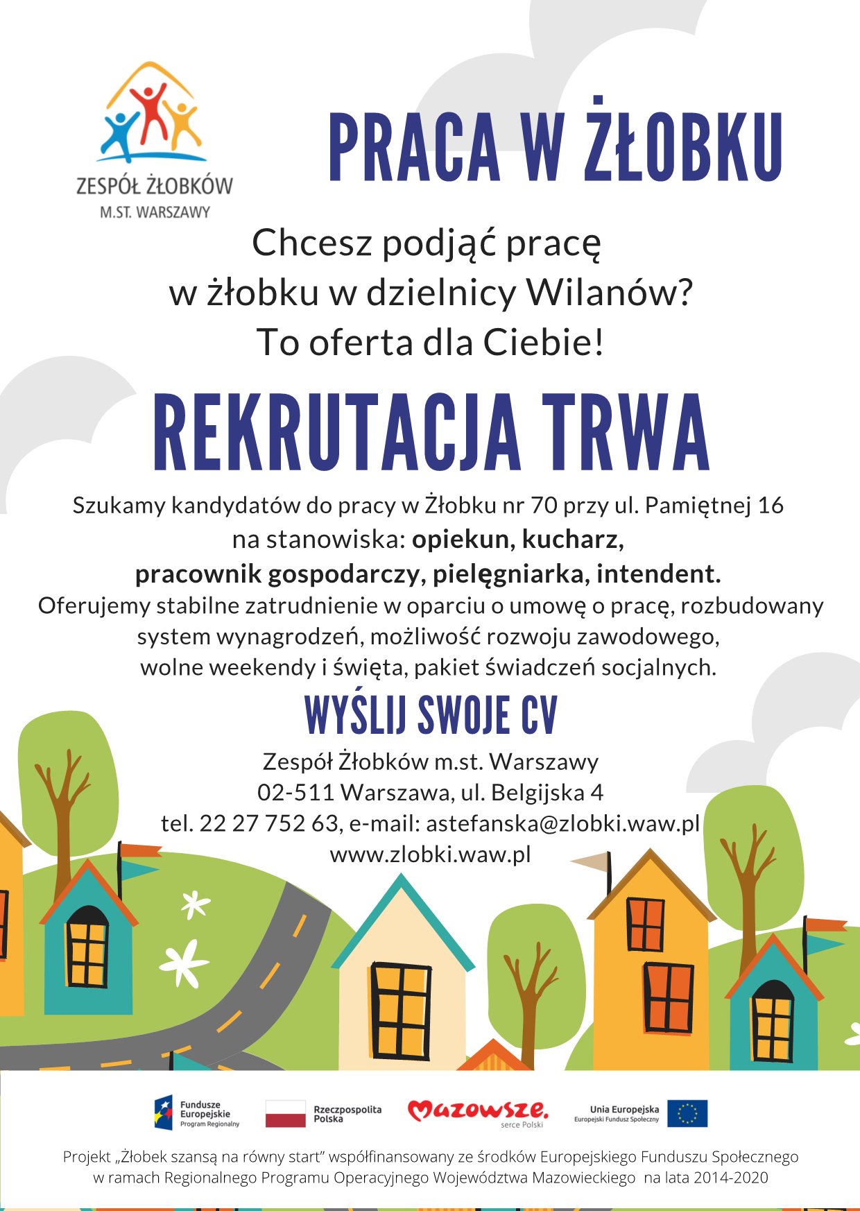 Szukamy kandydatów do pracy w Żłobku nr 70 przy ul. Pamiętnej 16 na stanowiska: opiekun, kucharz, pracownik gospodarczy, pielęgniarka, intendent. Oferujemy stabilne zatrudnienie w oparciu o umowę o pracę, rozbudowany system wynagrodzeń, możliwość rozwoju zawodowego, wolne weekendy i święta, pakiet świadczeń socjalnych.