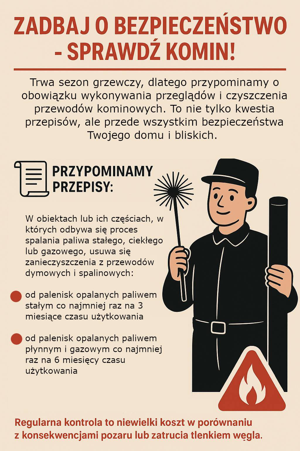 Trwa sezon grzewczy, dlatego przypominamy o obowiązku wykonywania przeglądów i czyszczenia przewodów kominowych. To nie tylko kwestia przepisów, ale przede wszystkim bezpieczeństwa.