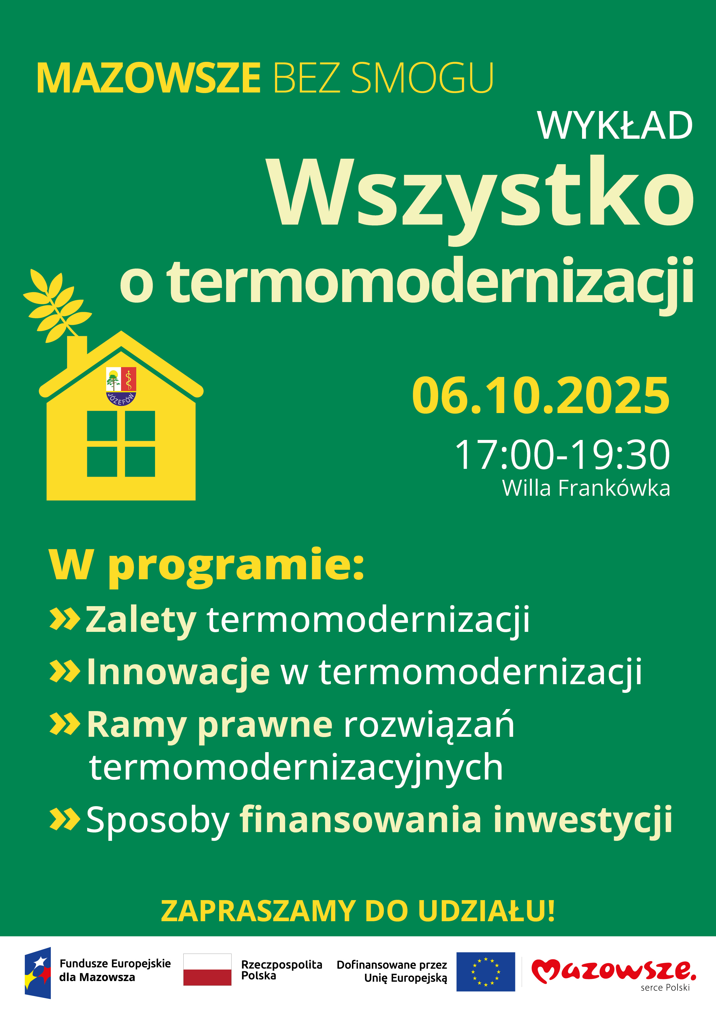 Wszystkich mieszkańców zapraszamy 6 października 2025 r. na godzinę 17:00 do Willi Frankówka na wykład dotyczący termomodernizacji budynków mieszkalnych.