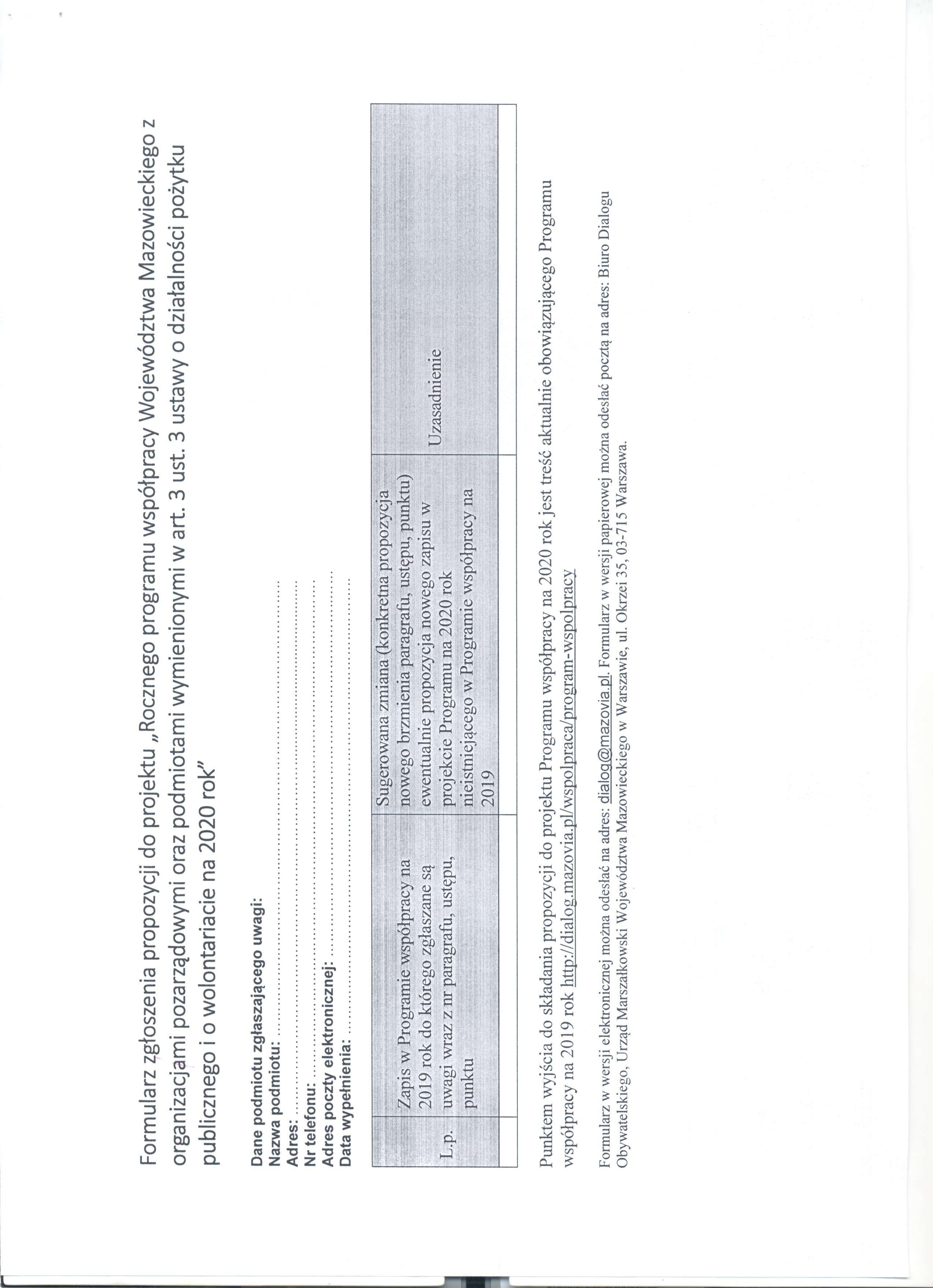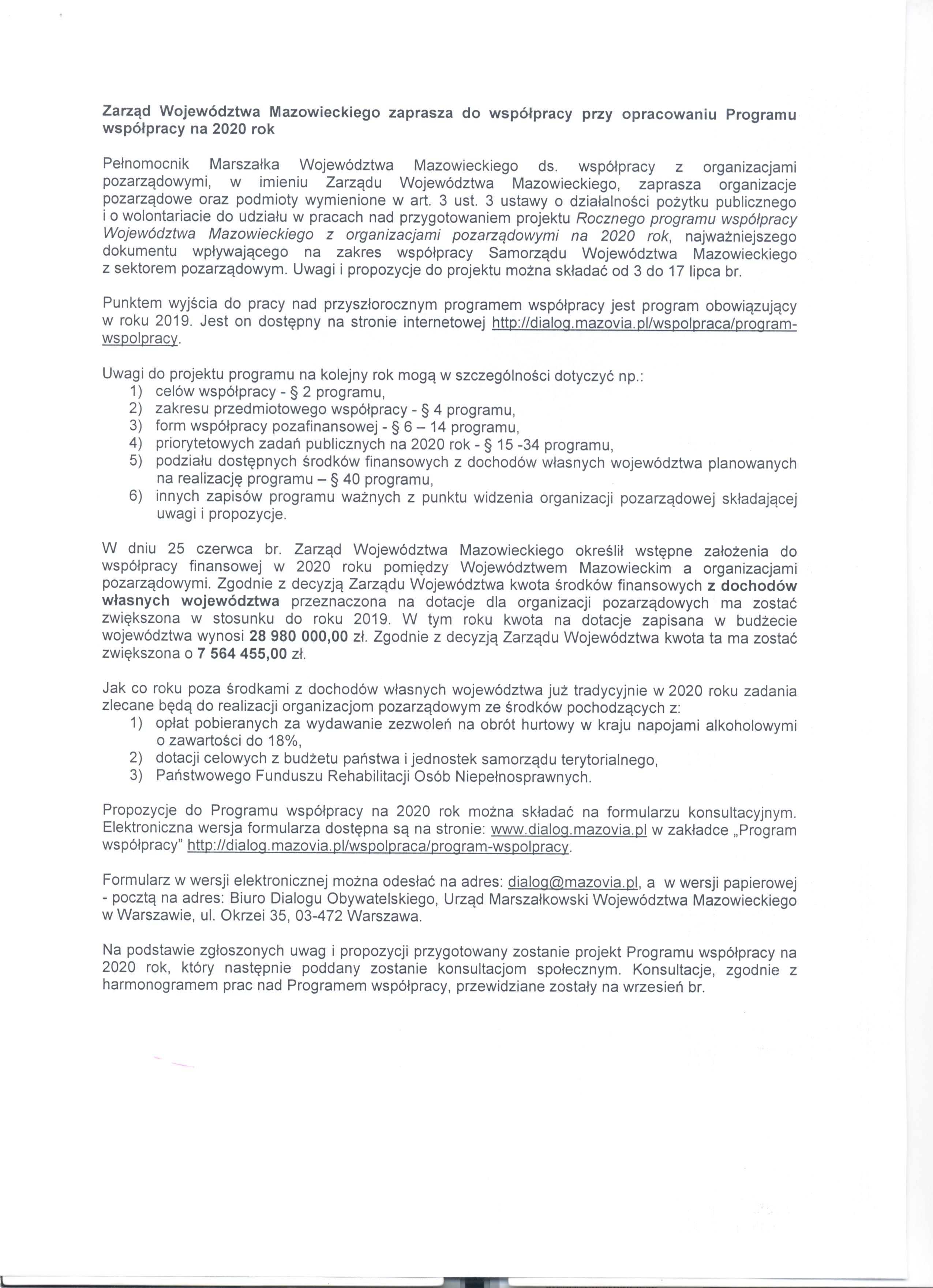 Pełnomocnik Marszałka Województwa Mazowieckiego ds. współpracy z organizacjami pozarządowymi, w imieniu Zarządu Województwa Mazowieckiego, zaprasza organizacje pozarządowe oraz podmioty wymienione w art. 3 ust. 3 ustawy o działalności pożytku publicznego i o wolontariacie do udziału w pracach nad przygotowaniem projektu Rocznego programu współpracy Województwa Mazowieckiego z organizacjami pozarządowymi na ork 2020, najważniejszego dokumentu wpływającego na zakres współpracy Samorządy Województwa Mazowieckiego z sektorem pozarządowym. Uwagi i propozycje do projektu można składać od 3 do 17 lipca br.