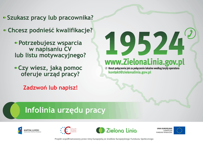 Zielona Linia, to pierwsze w kraju Centrum Kontaktowe dla Klientów urzędów pracy z całej Polski. Zielona Linia umożliwia kontakt Klienta z urzędem za pośrednictwem różnych kanałów dostępowych (telefon, e - mail, formularze internetowe, konta osobiste na portalu) zamiast osobistej wizyty w urzędzie.
